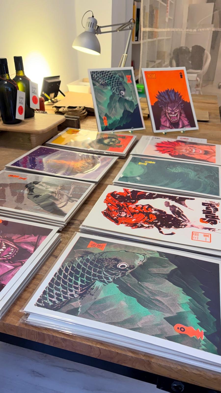 Risograph prints of Japanese themeD Yokai and manga/anime Fanart.